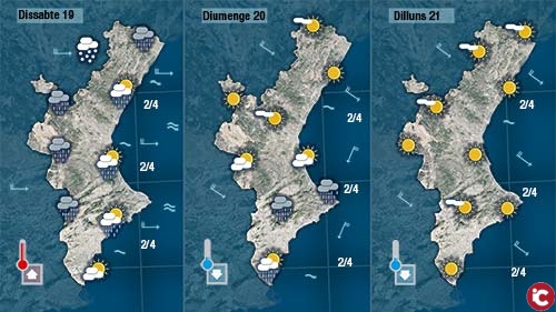 Haurem destar atents per vore com evoluciona loratge de cara al cap de setmana perquè tot i que dissabte el dia començarà sent assolellat acabarem amb el cel ennuvolat a bona part de la Comunitat i amb ruixats prou generals més probables per linterior i al nord on durant la matinada podria caure algu floc de neu en altures superiors als 1300 metres.