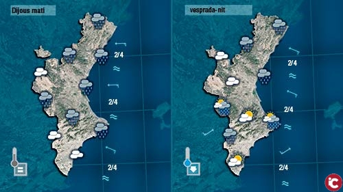 Demà dijous la inestabilitat i la pluja arribaran des de linterior i acabaran afectant tota la Comunitat encara que a migdia podran obrir-se clars al sud en bufar durant unes hores el vent de llebeig (sud-oest), però a poqueta nit tornarà a tancar-se el cel i a ploure amb gana.