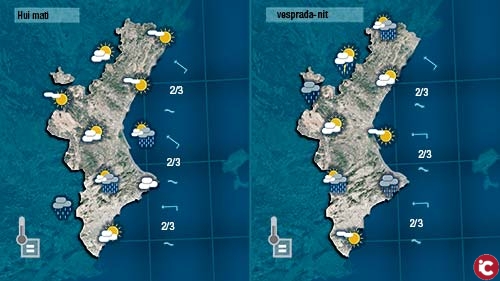 El dia ha començat amb sol o pocs núvols al nord i nuvolositat més abunant al sud on no descarte ruixats dèbils. Esta vesprada haurem destar atents als núvols de temspesta que es formaran en punts de muntanya i que a poqueta nit podran tocar punts de la costa de La Marina i La Safor.