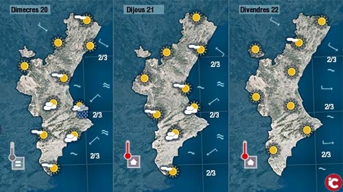 Hui encara serà el vent qui determine la situació meteorològica bufant fort al nord i mantenint l’ambient fred o fresc a tota la Comunitat. El sol ens acompanyarà des de primera hora del dia i només a poqueta nit començarem a vore núvols baixos entrant des de la mar i anunciant canvis per a demà.