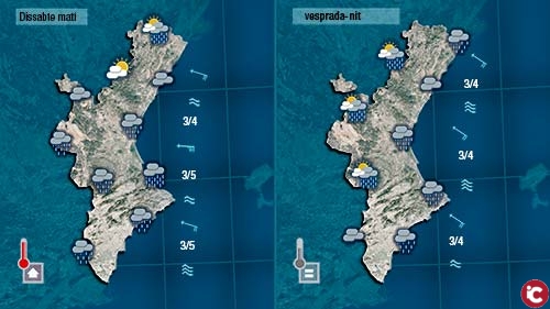 Hui encara cal esperar pluges intenses durant el matí a la mitad nord de la Comunitat. Pot ser escampe a migdia al centre però de nou tornarà la pluja de vesprada. La intensitat i el volum de les pluges que puguen registrar-se pensem que seran inferiors a les dahir. Al sud continuem sense poder anunciar pluja perquè allà el vent bufarà del sud-oest i fins i tot podran vore el sol.