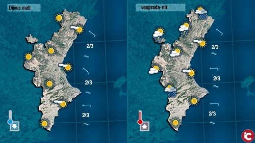Demà divendres, com aperitiu del cap de setmana, tindrem un dia assolellat i fins i tot calorós a les hores centrals. De vesprada es vaoran núvols a les muntanyes de Castelló però quasi descartem per complet que puga ploure.