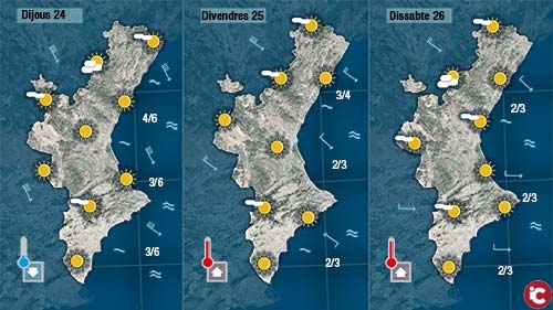 El matí transcorrerà hui amb pocs núvols però la direcció del vent ens indicarà per on entraran a partir de migdia deixant el cel més cobert a la mitad nord de la Comunitat on a més notarem un descens de les temperatures que farà que les precipitacions que es registren, encara que de caràcter dèbil, siguen en forma de neu entre els 900 i els 1.000 metres. Lestat de la mar anirà empitjorant sobretot fora de la protecció de la costa.