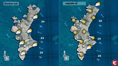 Demà divendres encara podrà ploure a primera hora. Fins a mig dia els núvols creuaran la Comunitat de nord a sud deixant precipitacions dèbils però prou generals. Al nord podria ploure més de gana. De vesprada acabarà imposant-se el sol.