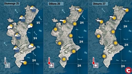Diumenge vorem més el sol però encara podrà ploure de vesprada. Ruixats de distribució molt irregular, més probables per linterior. El vent anirà a fluixant a partir de la vesprada per dobar pas a un inici de setmana amb vents fluixos, oratge estable i temperatures cada dia més altes. Situació que es mantindrà fins dijous