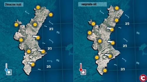 Mentre al nord es deixarà sentir el mestral, hi haurà poca nuvolositat i la visibilitat serà molt bona. Al sud el gregal i el llevant sencarregaran de portar núvols des de la mar i deixar ruixats dèbils i dispersos a les comarques més properes a la costa. Pot ser també tindrem el cel prou ennuvolat al centre i a linterior dAlacant, però a estes zones difícilment plourà.
