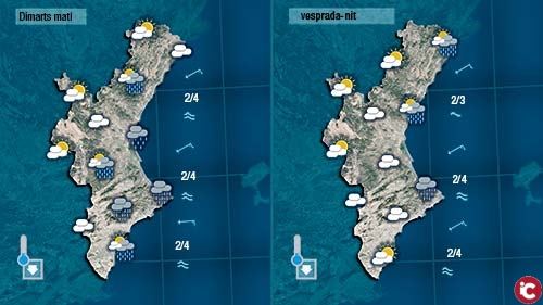 Demà dimarts el canvi serà notable. Pot ser la pluja ens faça patir i només aafecte punts de la costa i del prelitoral. Els núvols cobriran el cel de la major part de la Comunitat i les temperatures baixaran 4 o 5 graus. La persistència del Llevant deixarà la mar més alterada.