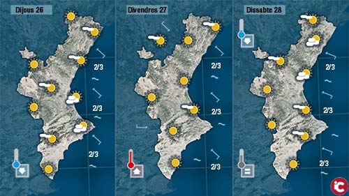 Demà dimecres encara es deixarà sentir el ponent durant el matí deixant més altes les temperatures nocturnes, però al centre del dia notarem un canvi en la direcció del vent. Bufarà de gregal i llevant acumulant núvols i portant un descens de les temperatures de més de 5 graus en alguns observatoris. Fins i tot no es descarta que puga caure alguna gota al nord.