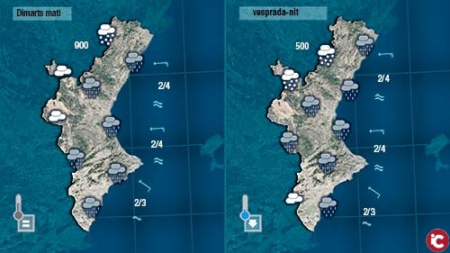El de hui serà un dia de trànsit entre loratge estable i assolellat del cap de setmana i les pluges geberals de demà. Les temperatures es mantindran sense canvis respecte a les del cap de setmana, i a poqueta nit i durant la matinada els núvols començaran a fer-se més compactes i a registrar-se les primeres precipitacions que al voltant dels 1.000 metres eran de neu.