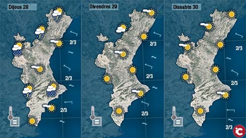 El dia serà hui tan calorós o més que ahir, però caldrà estar atents i mirar a partir de migdia a les muntanyes del nord perquè serà allà on apareguen les primeres senyals. A primera hora de la vesprada començarà plovent al nord. Les precipitacions, a mitja vesprada, acabaran tocant les comarques centrals castellonenques i no descarte que acaben eixin cap a la costa deixant també algun registre en punts del litoral (fins i tot podrien tocar la costa nord de Valencia).