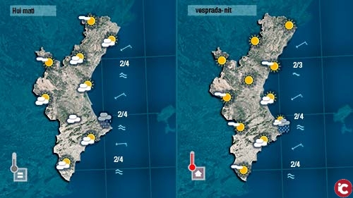 Serà al nord on desapareguen els núvols en primer lloc mentre que al sud encara podrà caure algun plugim, sempre més probable en punts pròxims a la costa. Esta vesprada tret dalgun ruixat despistat acabarà imposant-se el sol per tot arreu.