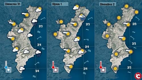 Dijous de matí el cel estarà més carregat al litoral del nord de València i de Castelló fins a migdia on podria ploure dèbilment. De vesprada escamparà la nuvolositat i començaran a pujar les temperatures que divendres i el cap de setmana sembla que tenen intenció de continuar pujant.