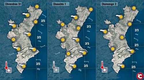 Una volta ha encalmat el vent notarem un ascens de les temperatures que serà més acusat al centre i per l’interior que a la costa on el xaloc s’encarrega de suavitzar l’ambient a migdia. A molts observatoris del centre i de l’interior les màximes arribaran hui als 27 o 28 graus.