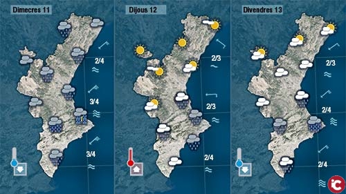 Un mestral que entrarà pel nord de la Comunitat acompanyat duna massa daire més freda que portarà un progressiu descens de les temperatures La nuvolositat serà variable, i de tant en tant podrà ploure de forma intermitent.