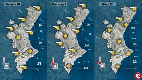 Hui encara haurem de tindre paciència al nord on el vent no daixarà de bufar en tota la jornada, però al centre i al sud bufarà del sud-est aportant més humitat i més fresca des de la mar. Les temperatures diürnes baixaran més de 5 graus als oobservatoris de la costa.