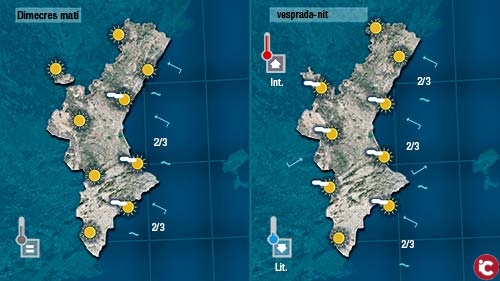 Demà dimecres el vent encalmarà i serà el xaloc qui predomine. Les temperatures pujaran a ponent i baixaran a la costa. Vorem pocs núvols al cel.
