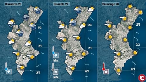 Divendres serà un dia estrany. Tindremes temperatures més baixes, sobretot al nord on el mestral i la presència de núvols provocaran un descens entre 2 i 5 graus en els termòmetres. Al centre i al sud, on el ponent i el llebieg no deixaran de bufar, el descens de les temperatures serà mínim.