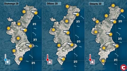 Diumenge el xaloc (vent del sud-est) substituirà de nou al ponent afavorint un descens tèrmic tot i que la humiat tornarà a pujar.