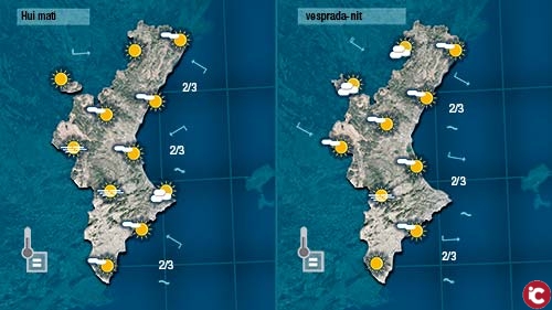 De l’oratge de hui poc a destacar. Anticicló i ambient boirós de matí i augment de la nuvolositat de cara a la nit quan el vent comence a deixar-se sentir de component oest.