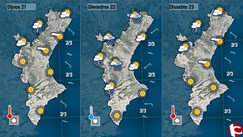 No serà fins divendres quan puguem tindre precipitacions més generals i efectives. Després dun matí assolellat es formaran núvols devolució a partir de migdia per linterior i alguns models donen precipitacions a última hora de la vesprada o a poqueta nit al centre i en punts de la costa. El vent acabarà girant a gregal i les temperatures patiran una sensible baixada.
