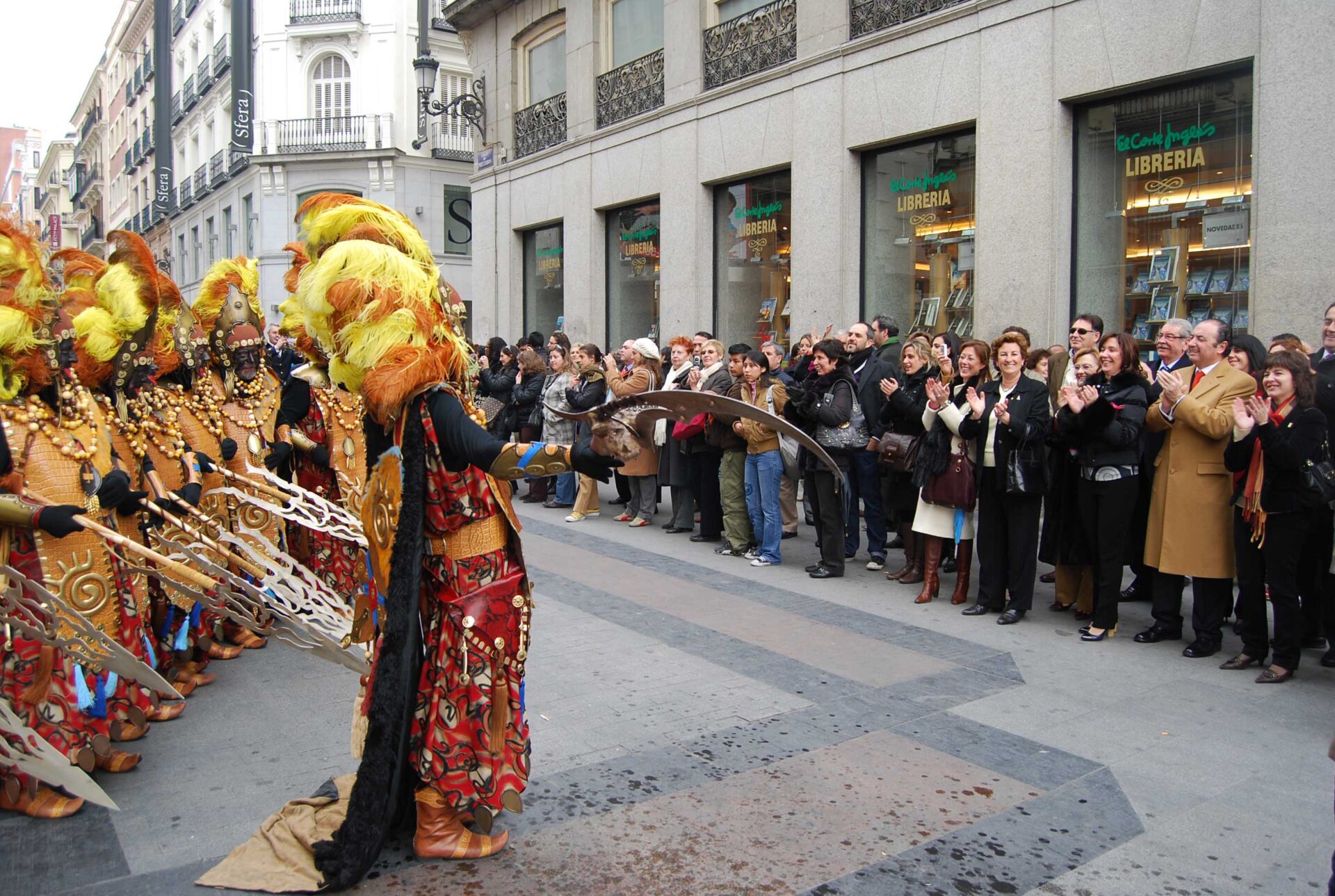 La calle Preciados estuvo repleta de público y colorido con la representación del desfile de Moros y Cristianos. La realización del desfile la formarán más de quinientas personas entre bandas de música y festeros ataviados con la indumentaria propia de los Moros y Cristianos.