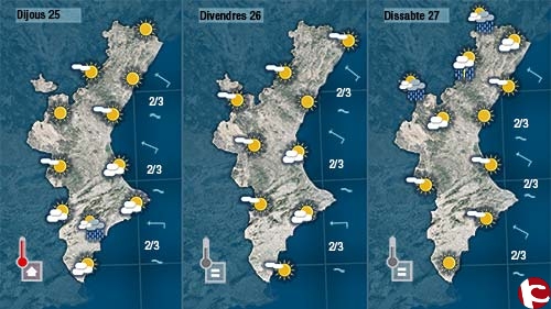 Trobarem condicions molt similars la resta de la setmana. Filant molt prim podriem tindre més núvols entre dijous i divendres a les zones costaneres del sud de la Comunitat, i dissabte a les muntanyes de nord.