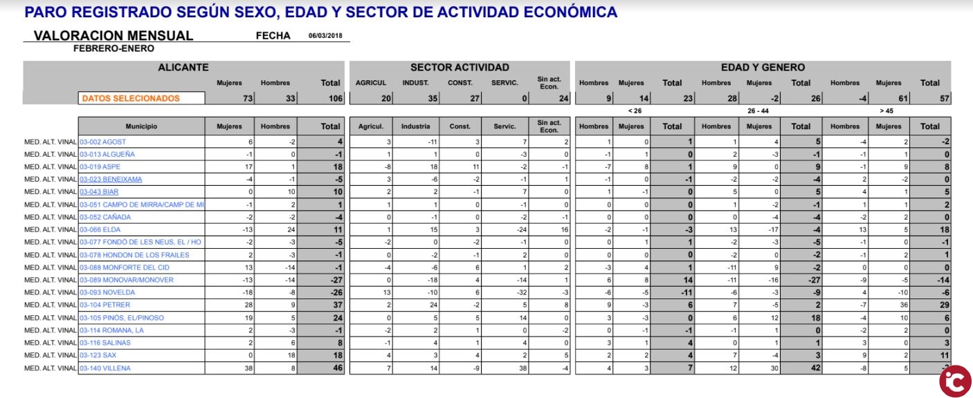 Los datos del paro correspondientes al mes de febrero publicado por los servicios públicos de empleo (SERVEF) en nuestra unión comarcal Muntanya-Vinalopo-Vega Baja en la zona del Medio Alto Vinalopo con respecto a febrero indican un aumento de 106 personas lo que sitúa el número total de desempleados en 22.969. Desde UGT seguimos insistiendo en que nuestro mercado laboral esta empeorando y no mejorando ya que la contratación sigue siendo precaria y las condiciones laborales siguen empeorando. Por lo que seguimos insistiendo en que las políticas de empleo deben modificarse para conseguir empleo de calidad y con derechos.