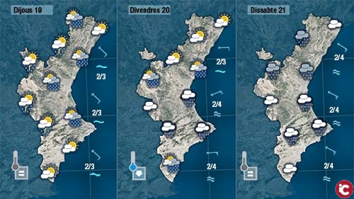 Dijous les tronades seran més generals i podran avançar més cap a lest tocant el centre i localment punts de la costa. Es disiparan durant la matinada de dijous a divendres, i encara que divendres podrem vore el sol la major part de dia a última hora de la vesprada o a poqueta nit els núvols deixaran el cel cobert registran-se les primeres pluges de cara a la nit.