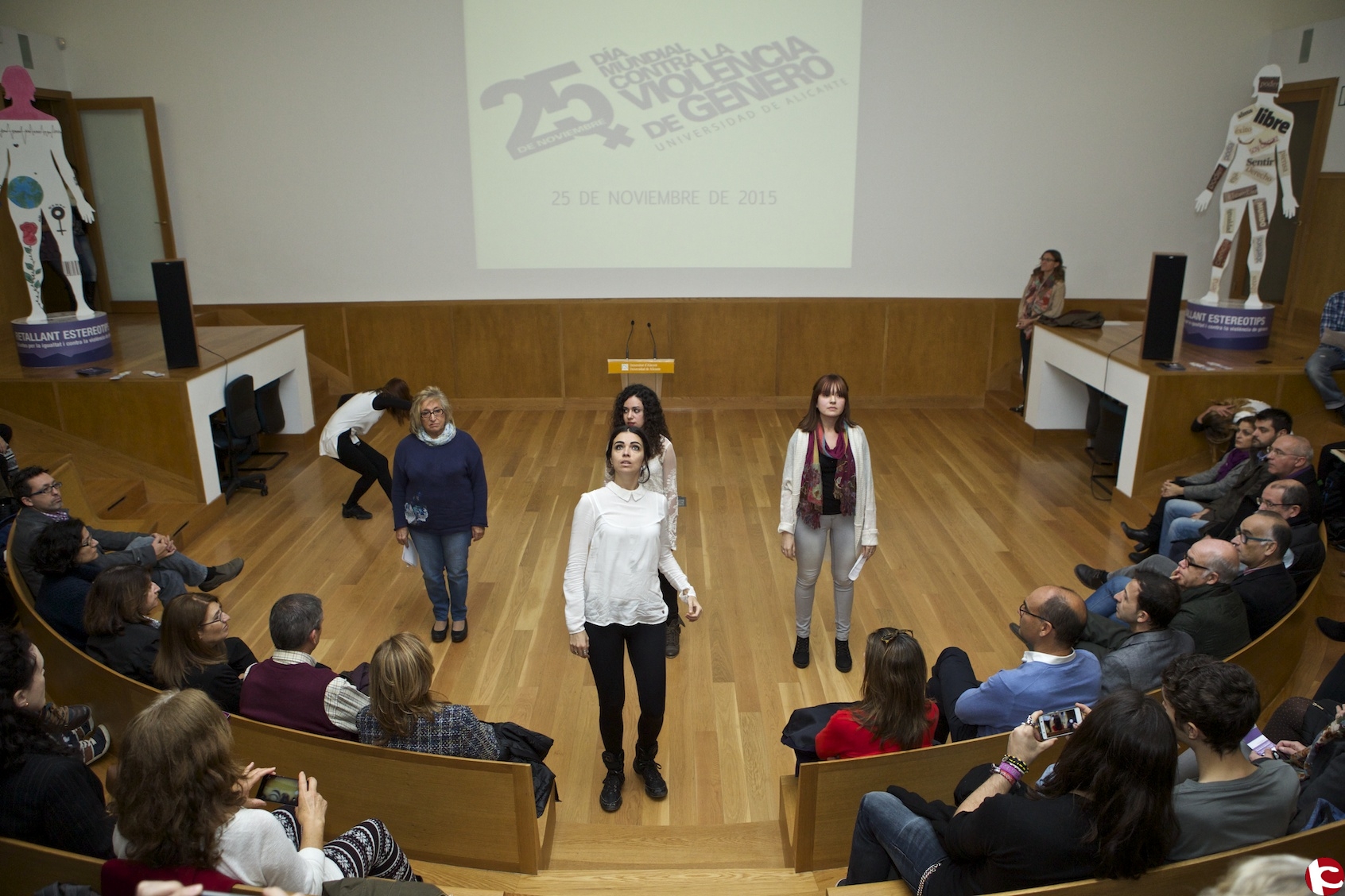 La Universitat d´Alacant reivindica el Dia Internacional per l´Eliminació de la Violència contra les Dones amb un minut de silenci a la Plaça de la Igualtat, cinc siluetes de de gran tamany per vestir amb «missatges per a la reflexió» i una representació dels «estereotips» de la violència en la relació de parella.