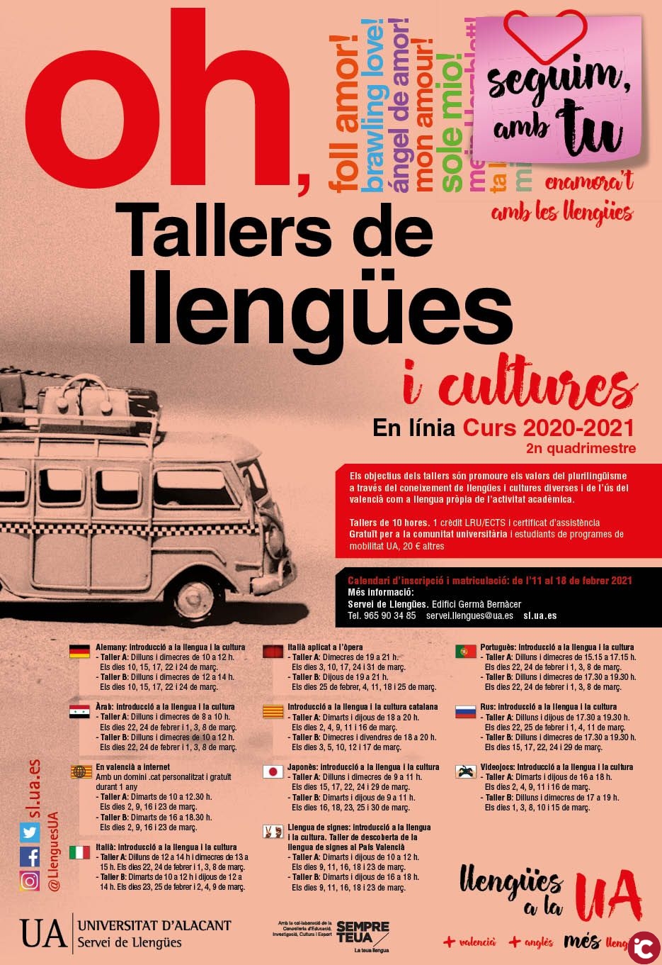 Como novedad en esta edición se ofertan 3 nuevos talleres: Italiano aplicado a la ópera; Videojuegos: introducción a la lengua y la cultura y En valencià a Internet, y continúan los ya tradicionales Introducción a la lengua y la cultura alemana, árabe, catalana, italiana, japonesa, lengua de signos, portuguesa y rusa. La matrícula es gratuita para los miembros de la comunidad universitaria. Cualquier otra persona interesada podrá inscribirse con un precio de matrícula de 20 euros. El plazo de matrícula es del 11 al 18 de febrero.