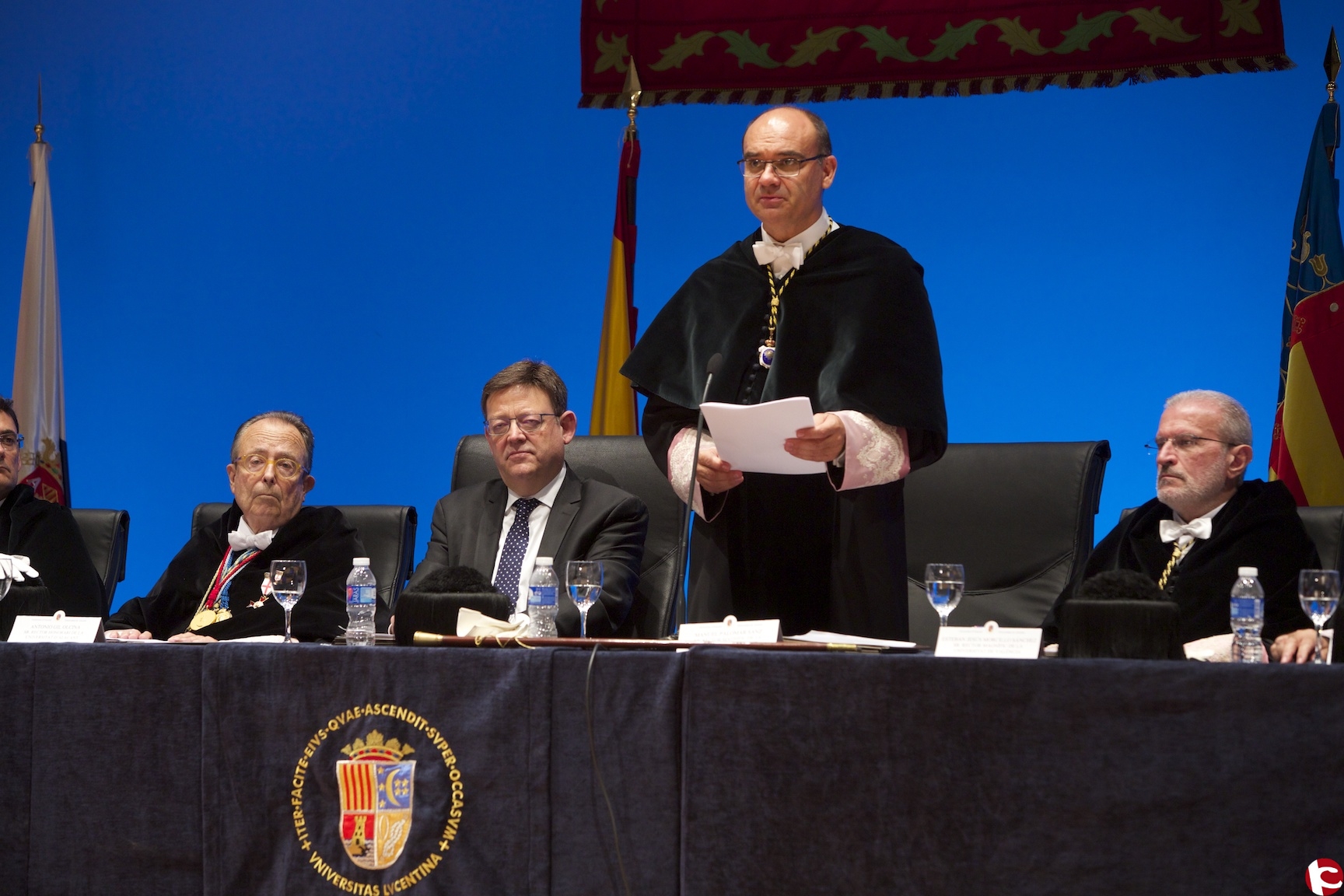 Precisamente, el rector de la Universidad de Alicante, Manuel Palomar, ha centrado su discurso en el que considera «el verdadero problema de la universidad pública española: la financiación». «No es factible, aspirar al nivel de los centros de excelencia universitaria del mundo con una inversión por alumno más baja que la de aquellos», ha dicho el rector que ha supeditado «el buen cumplimiento de nuestros compromisos», a la puesta en marcha de una Ley de Financiación de las Universidades «estable y equitativa», «que nos permita desarrollar nuestras labores en un marco de estabilidad presupuestaria y normativa». Palomar ha recordado la «severa dieta de financiación» a la que han sido sometidas las universidades valencianas «entre 2004, bastante antes de que la crisis se anunciara y en coincidencia con una inversión pública alternativa y ruinosa en múltiples Grandes Proyectos y Ciudades Temáticas, y 2014».