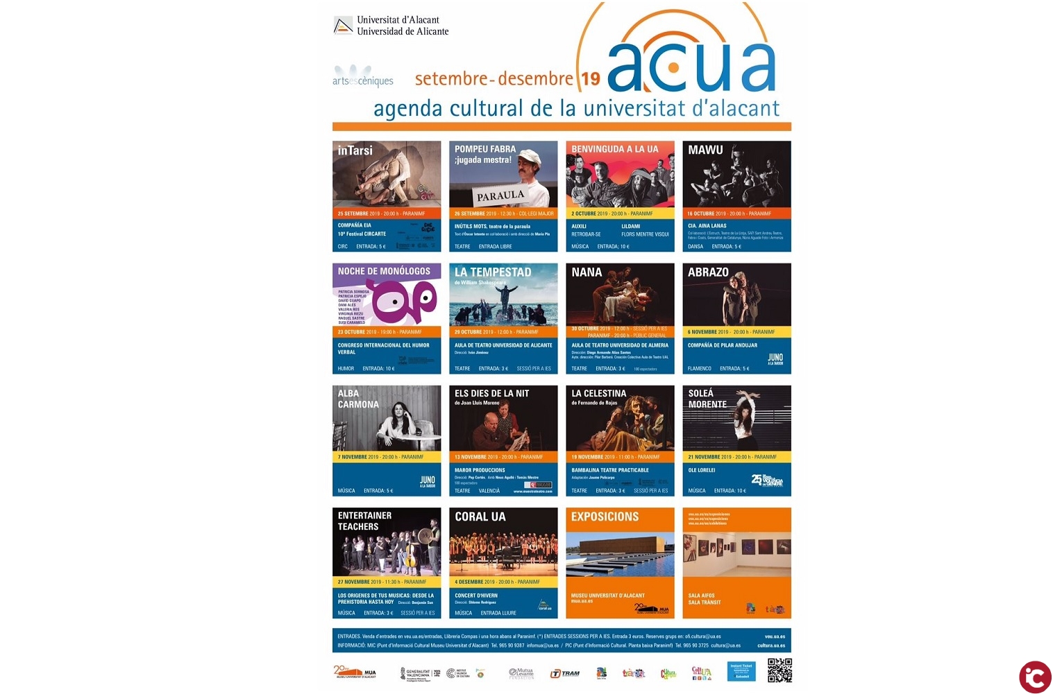 La programació arranca el dimecres 25 de setembre en el Paranimf amb la funció de circ contemporani In Tarsi, a càrrec de la Companyia Eia, inclosa en el Festival Circarte amb el qual la UA manté la col·laboració habitual des de fa anys. Aquesta obra ha sigut guardonada com a Millor Espectacle Revelació en els Premis Max 2017. L’endemà, el dijous 26 de setembre, s’inaugura l’apartat teatral amb l’obra Pompeu Fabra: jugada mestra. Inútils mots, a càrrec de Teatre de la Paraula (Col·legi Major a les 12.30 hores amb entrada lliure) i continuarà amb l’obra de l’Aula de Teatre de la UA La tempestad (el 30 d’octubre: a les 12.30 h i en el Paranimf), i amb l’obra Nana, a càrrec de l’Aula de Teatre de la Universitat d’Almeria (el 30 d’octubre en el Paranimf amb dues sessions: a les 12.30 h i a les 20 hores). Al novembre, la programació teatral inclou dues propostes teatrals més: Els dies de la nit, a càrrec de Maror Produccions, inclosa en la Mostra de Teatre d’Autors Contemporanis (dimecres 13 de novembre a les 20 hores), i La Celestina, que serà posada en escena per Bambolina Teatre Practicable (dimarts 19 de novembre a les 11 hores).