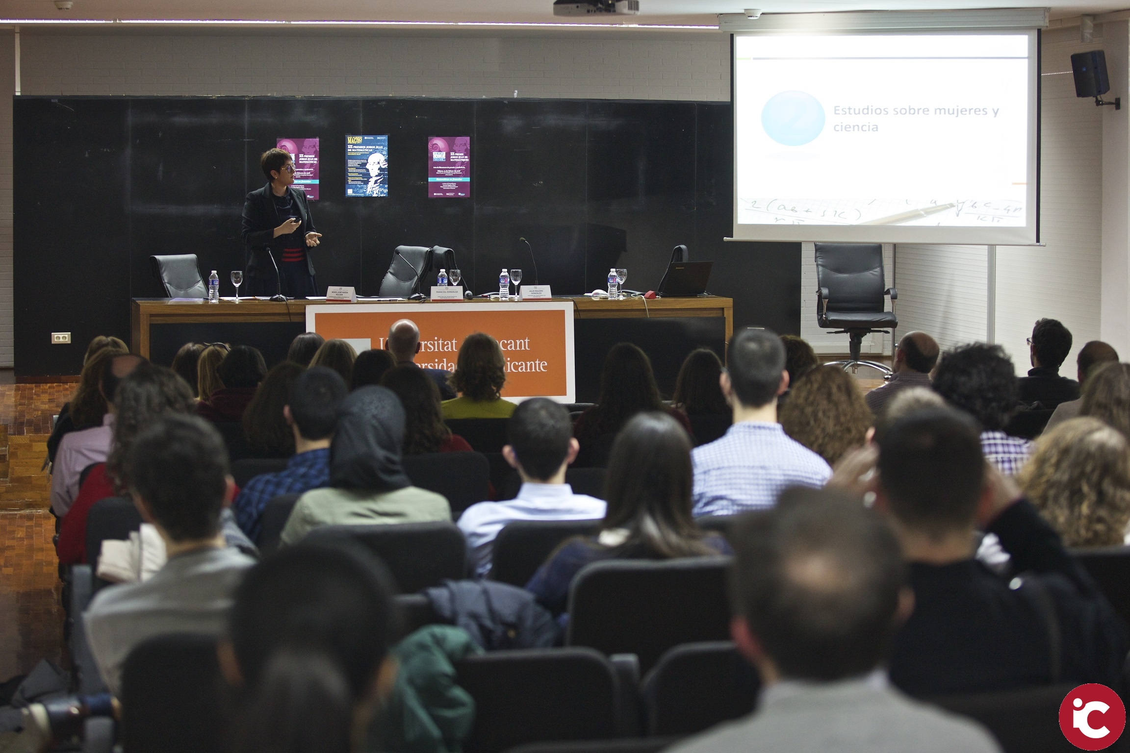 A càrrec de Lorena Segura, professora del Departament de Matemàtiques i membre de Dimates (grup de divulgació matemàtica de la UA) la intervenció, emmarcada en el Dia Internacional de la Dona i la Xiqueta en la Ciència, va visibilitzar la tasca de les dones que van contribuir substancialment a l’avanç de les matemàtiques. «El meu objectiu», assenyala Segura, «ha sigut emmarcar el context social al qual s’han enfrontat les dones recorrent algunes opinions de personatges influents d’èpoques diferents, així com exposar alguns estudis sobre ciència i gènere. A més, finalment, amb petites pinzellades, he parlat del treball de les dones que han contribuït substancialment a l’avanç de matemàtiques com Hipatia, Sophie Germain, Ada Lovelace, Emmy Noether o, més actual, Maryam Mirzakhani, entre moltes altres».