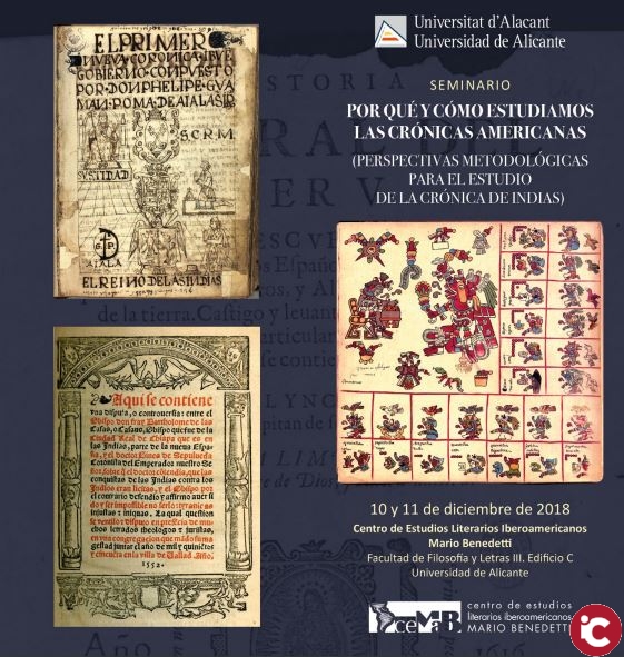 Dilluns que ve, 10 de desembre, començarà el seminari «Per què i com estudiem les cròniques americanes (perspectives metodològiques per a l’estudi de la Crónica de Indias)», una trobada que aplegarà, durant dues jornades, especialistes de diverses disciplines en el Centre d’Estudis Literaris Iberoamericans Mario Benedetti de la UA (Facultat de Filosofia i Lletres III). Els organitzadors proposen una reflexió sobre un corpus de textos que continua suscitant interès en el segle XXI i que pot ser també tema dinvestigació per a lalumnat de graus i màsters.