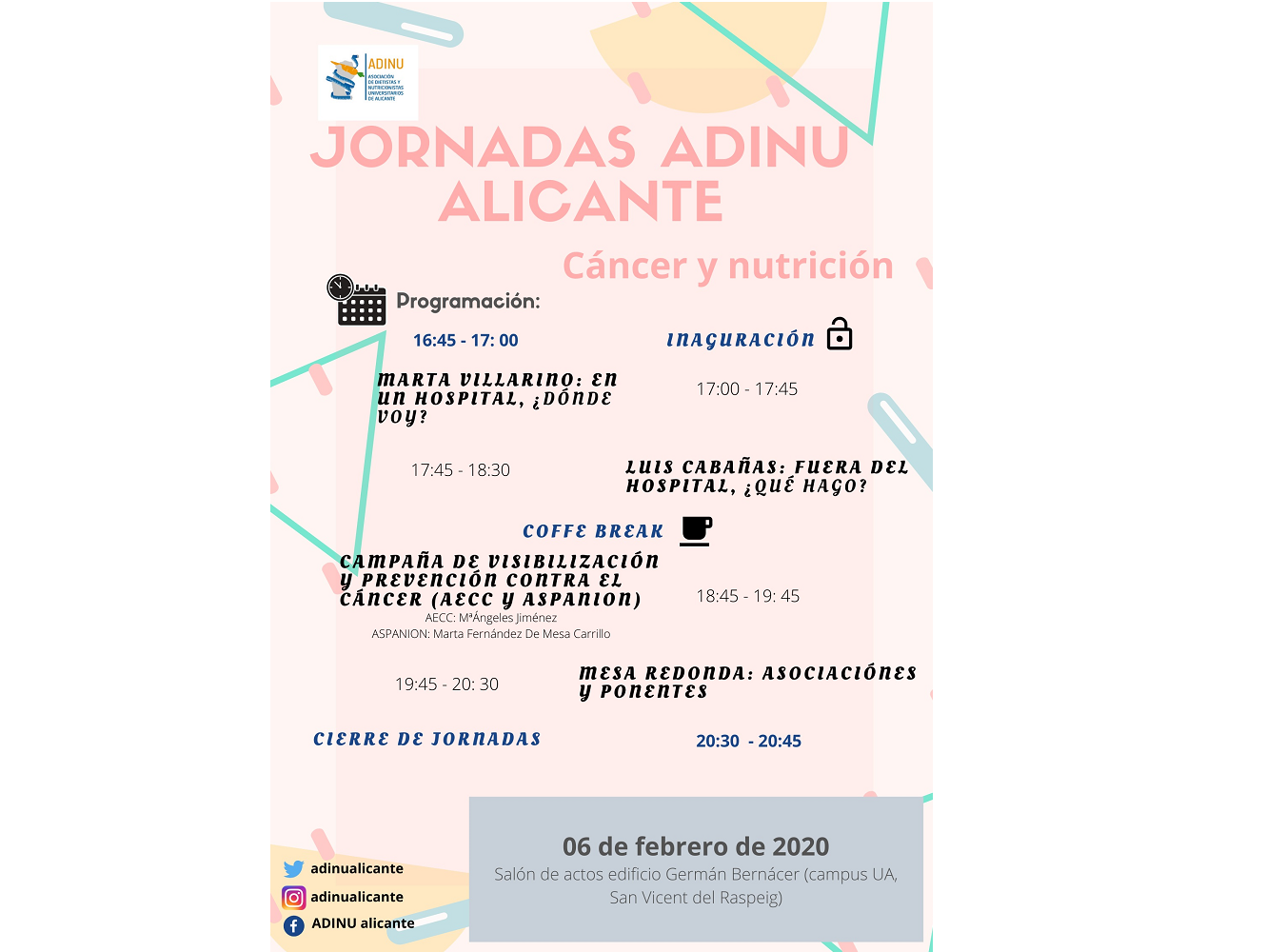 Amb motiu del Dia Mundial contra el Càncer, lAssociació de Dietistes-Nutricionistes Universitaris dAlacant (ADINU Alacant) organitza una jornada temàtica centrada en el pacient oncològic el pròxim dijous 6 de febrer a la sala dactes de lEdifici Germà Bernàcer de la Universitat dAlacant.