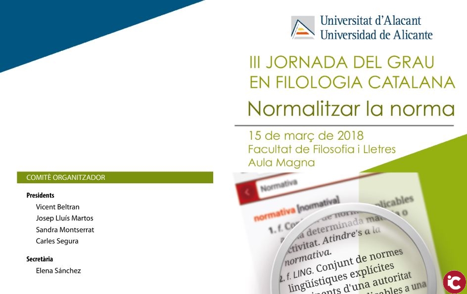 Laula magna de la Facultat de Filosofia i Lletres de la UA acull, demà dijous 15 de març de 2018, la III Jornada del Grau en Filologia Catalana. Distribuïdes en sis sessions que començaran a les 9.00 hores i acabaran passades les 19.00 hores, les jornades arranquen amb la finalitat de parlar sobre la norma, la creació de gramàtiques i diccionaris, arran de la publicació recent de la Gramàtica de la llengua catalana de lInstitut dEstudis Catalans (IEC), obra pensada com a gramàtica normativa de referència del segle XXI. Amb aquest propòsit, tant lalumnat com el professorat del grau shan implicat i estan molt involucrats en lorganització dels actes.