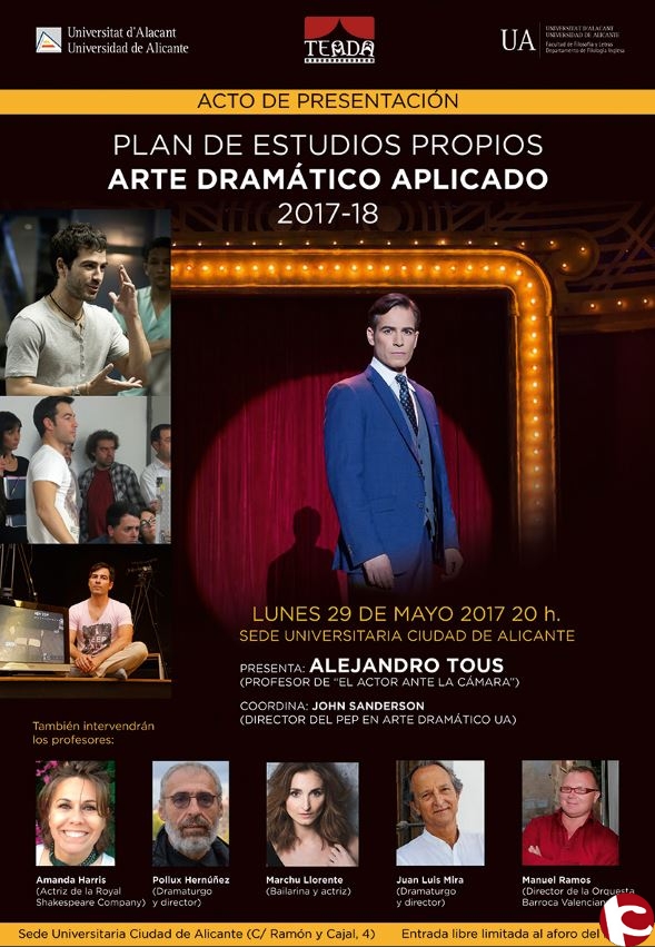 El màster en Art Dramàtic Aplicat de la UA presentarà el programa destudis per al pròxim curs acadèmic 2017-2018, el pròxim dilluns 29 de maig a les 20 hores a la Seu Ciutat dAlacant (Ramón y Cajal, 4).