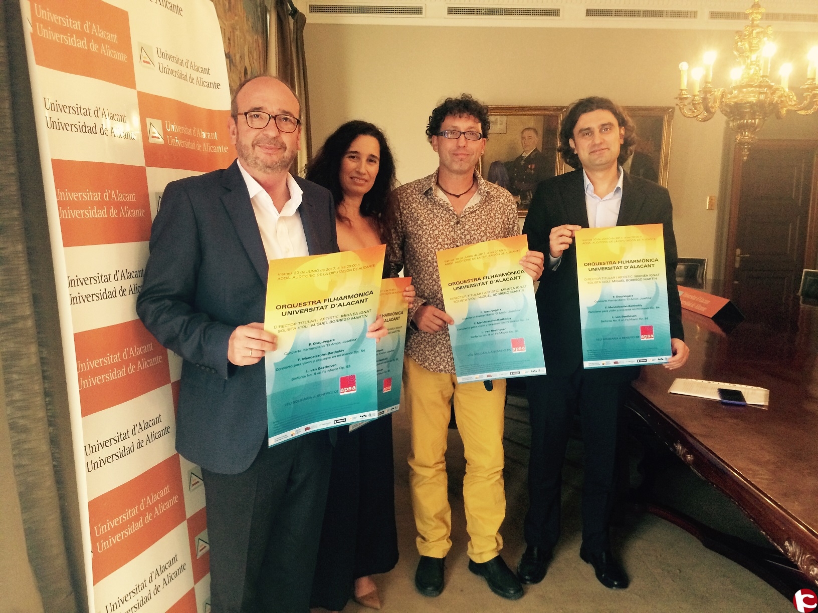 El concert del divendres 30 de juny, que lOFUA oferirà en lAuditori Provincial de la Diputació dAlacant (ADDA) a les 20 hores, tindrà un caràcter solidari i la recaptació anirà destinada a lAssociació APSA, amb un preu de lentrada/donatiu de 15 euros, i també sha habilitat la fila zero per als qui hi vulguen col·laborar però no puguen assistir a lacte. Aquest concert benèfic té el patrocini específic de la Fundació Marjal.