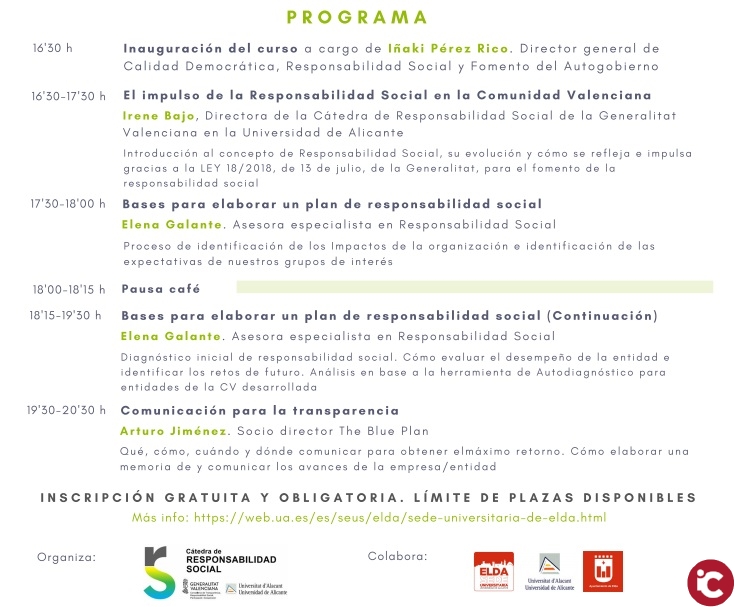 El curs és gratuït amb places limitades, motiu pel qual és imprescindible la inscripció prèvia. Es desenvoluparà el dimarts 29 d’octubre en horari de 16.30 a 20.30 h al Centro Cívico y Juvenil. Comptarà amb experts especialistes en responsabilitat social de la Càtedra de la Universitat d’Alacant i d’empreses especialitzades. A la inauguració assistirà Iñaki Pérez Rico, director general de Qualitat Democràtica, Responsabilitat Social i Foment de l’Autogovern.