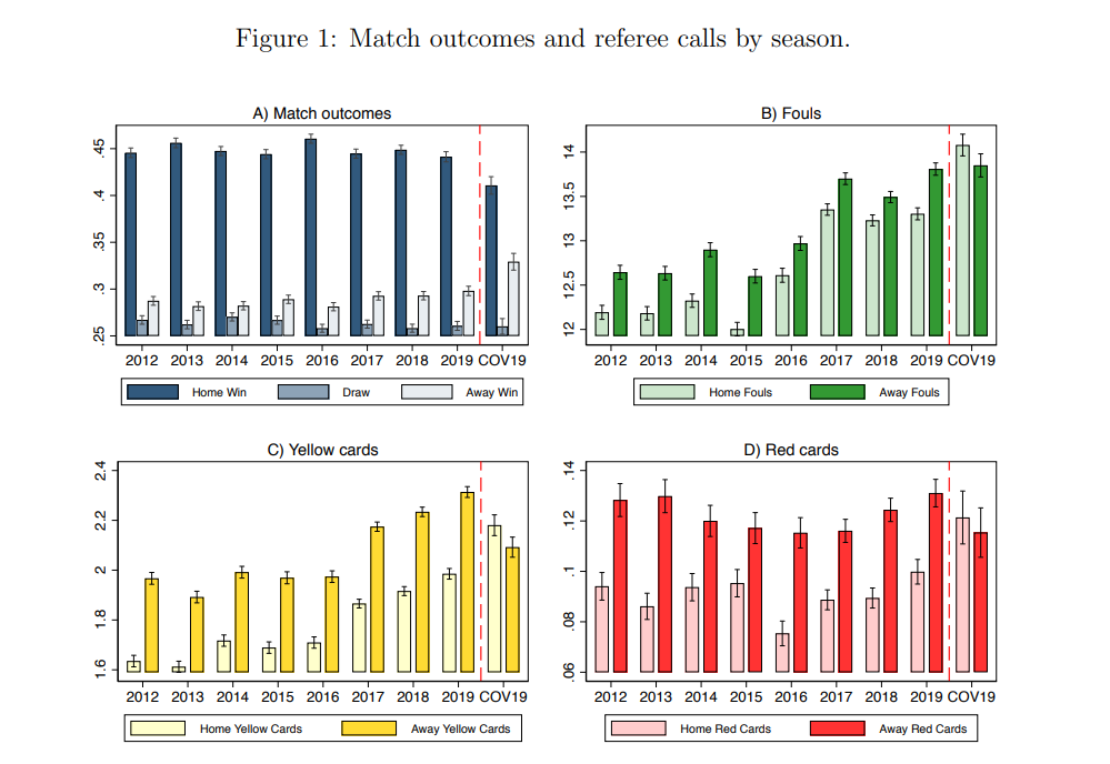 Segons mostra la gràfica blava (Fig.1), un equip que jugue de local té un 4% menys de possibilitats de guanyar que abans de la pandèmia, i el seu rival un 4% més. En els gràfics verds, groc i roig (Fig.1), el comportament dels jutges sobre el camp varia visiblement quan no hi ha pressió des de la graderia. «Passa dhaver-hi una clara desigualtat a favor de lequip de casa a igualar-se », puntualitza Cueva.