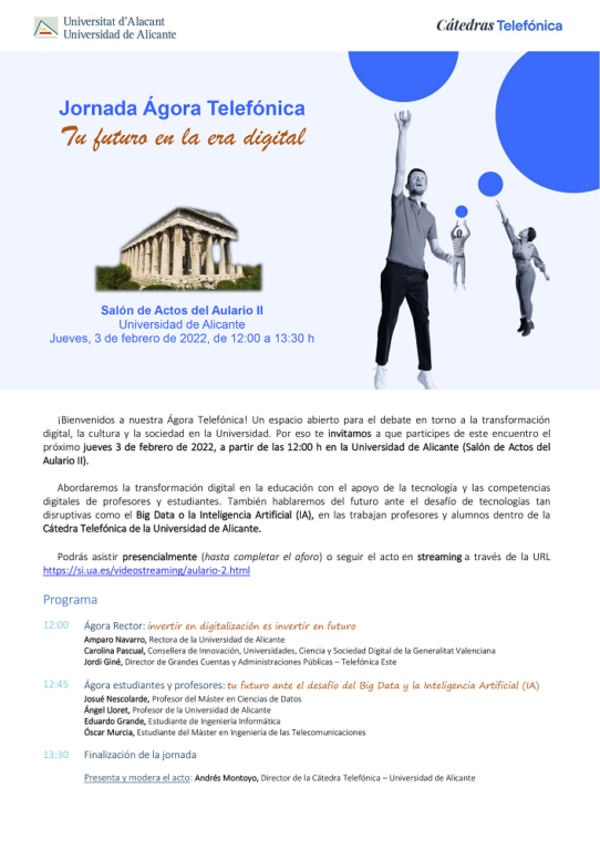 El 3 de febrer a partir de les 12.00 hores, a la sala d’actes de l’aulari II de la Universitat d’Alacant, tindrà lloc la Trobada Àgora Telefònica sobre l’Educació i les TIC, organitzat per la Càtedra Telefònica de la Universitat d’Alacant.