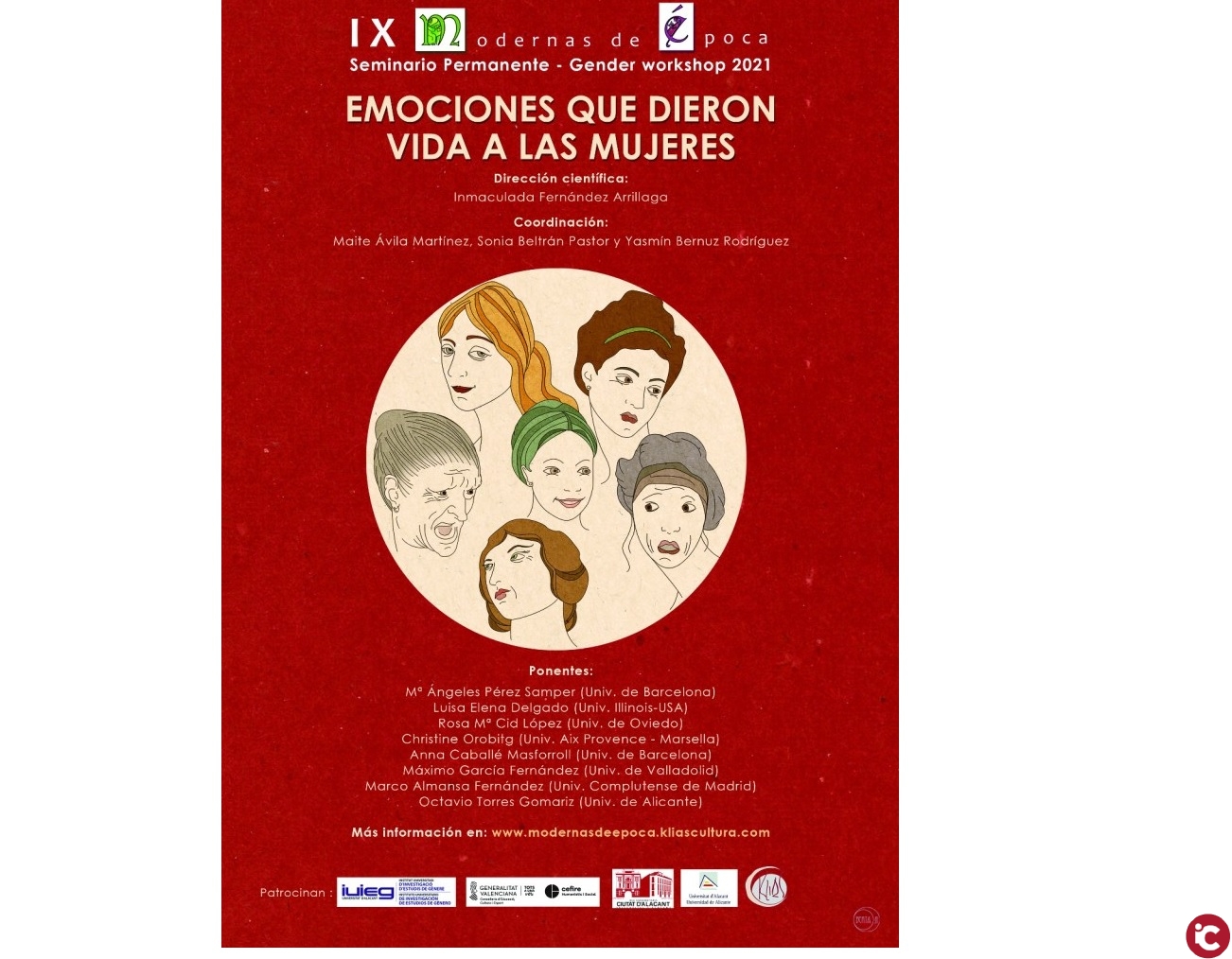 «Emocions que van donar vida a les dones» és el títol específic de la novena edició del Seminari Permanent Modernes dÈpoca, seminari obert i gratuït organitzat per lInstitut Universitari dInvestigació en Estudis de Gènere (IUIEG) i la Seu Universitària Ciutat dAlacant de la Universitat dAlacant, enguany sota la temàtica de la història de les emocions i els sentiments viscuts per les dones i interpretats des de diferents ciències. Per a això, el seminari compta amb la participació despecialistes daltres ciències, que aportaran les seues visions diferents, com són hispanistes, experts en història antiga o en literatura, entre altres.