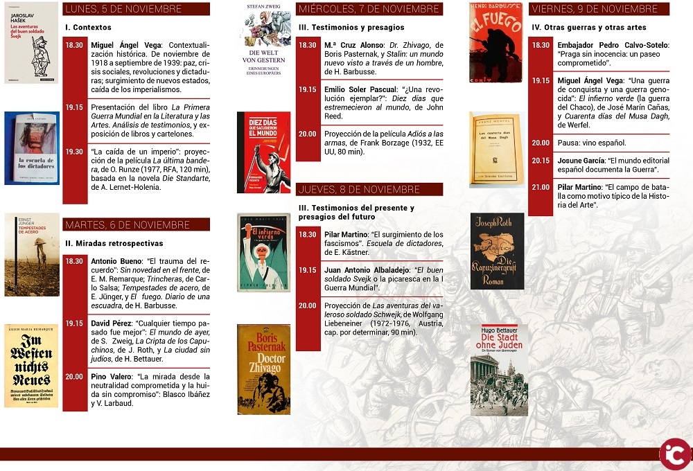 El cicle començarà dilluns que ve, 5 de novembre, a les 18.30 hores, a les instal·lacions de la Seu de Sant Ferran, 40, amb una primera sessió dedicada als «Contextos», que inclourà una conferència a càrrec de Miguel Ángel Vega, la presentació del llibre La Primera Guerra Mundial en la literatura y las artes i la projecció de la pel·lícula La última bandera.