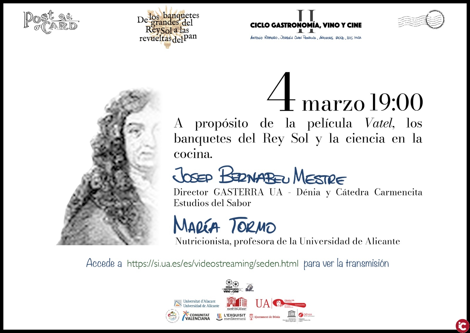 Aquest dijous 4 de març el cinefórum gira entorn de la pel·lícula Vatel (Roland Joffé, 2000) protagonitzada per Gérard Depardieu a través de la conferència «A propósito de la película Vatel, los banquetes del Rey Sol y la ciencia en la cocina», que impartirà Josep Bernabeu Mestre, director del Centre de Gastronomia del Mediterrani GASTERRA UA-Dénia i de María Tormo, professora del Departament dInfermeria Comunitària, Medicina Preventiva, Salut Pública i Història de la Ciència de la UA.