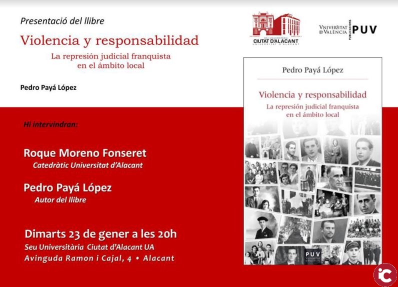 Demà dimarts, 23 de gener, a les 20 hores, a la Seu Universitària Ciutat d’Alacant (c/ Ramón y Cajal, 4), Pedro Payá, professor del Departament d’Història Contemporània de la UA, presentarà el seu últim llibre, Violencia y responsabilidad. La represión judicial franquista en el ámbito local. L’acte estarà moderat per Roque Moreno, catedràtic de la Universitat d’Alacant.