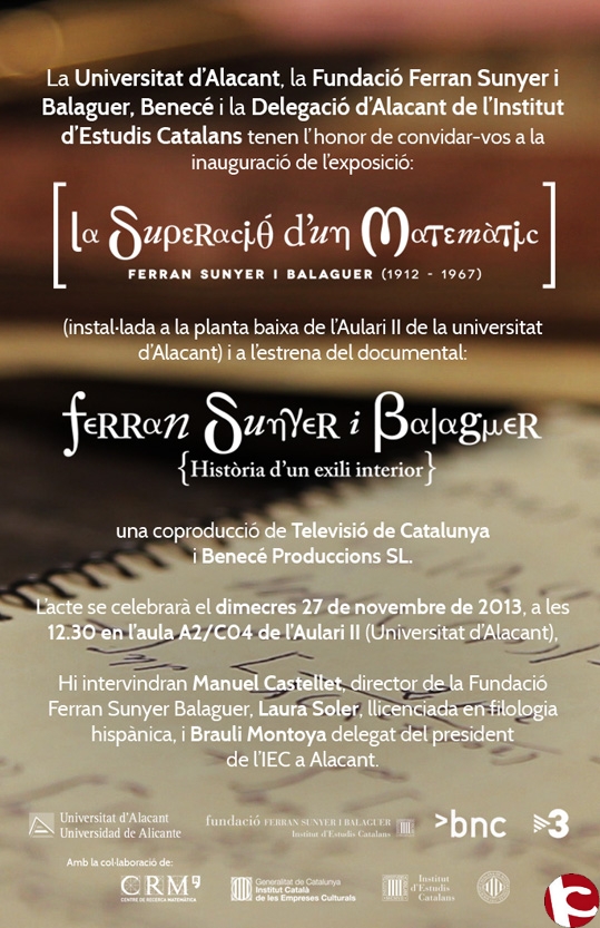 25 de noviembre de 2013.-La Fundació Ferran Sunyer, la Delegació de l´IEC d´Alacant y la Universidad de Alicante exponen en la Sala Tránsit del Aulario II la muestra La Superación de un Matemático, sobre el matemático catalán Ferran Sunyer.
