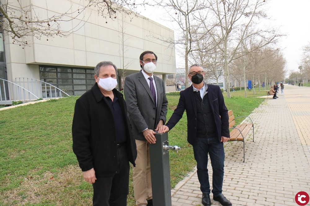 Peu de foto: José Ramón Martínez, director del Secretariat de Sostenibilitat i Salut Laboral, Salvador Ivorra, vicerector d’Infraestuctures, Sostenibilitat i Salut Laboral, i David Ribes, director de Qualitat d’Aigües d’Alacant, en una de les fonts disponibles al campus