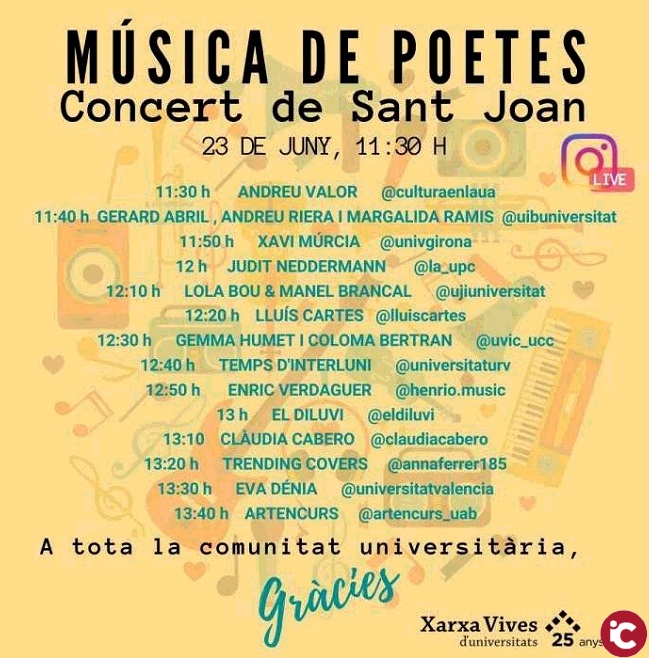 La Universitat d’Alacant se suma al concert universitari Música de poetes, una inciativa de la Xarxa Vives d’Universitats per a celebrar el dia de Sant Joan. El concert tindrà lloc dimecres, 23 de juny, a partir de les 11.30 hores, a través de l’Instagram Live de cada universitat o dels artistes participants. Aquesta plataforma permet seguir els concerts en directe i en diferit, fins a les 24 hores posteriors.
