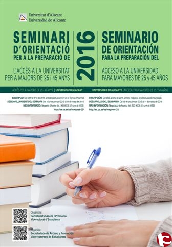 La Universidad de Alicante pone en marcha, como en años anteriores y para establecer unas pautas de trabajo que orienten al alumnado en la preparación de las asignaturas comunes y específicas que componen las pruebas, el Seminario de Orientación para la preparación de las pruebas de mayores de 25 y 45 años. El plazo de matrícula se abre el próximo lunes 28 de septiembre y finalizará el 8 de octubre de 2015. El seminario se va impartir los viernes por la tarde, comenzando el de 16 octubre de 2015 y finalizando el 11 de marzo de 2016. El número de plazas está limitado.