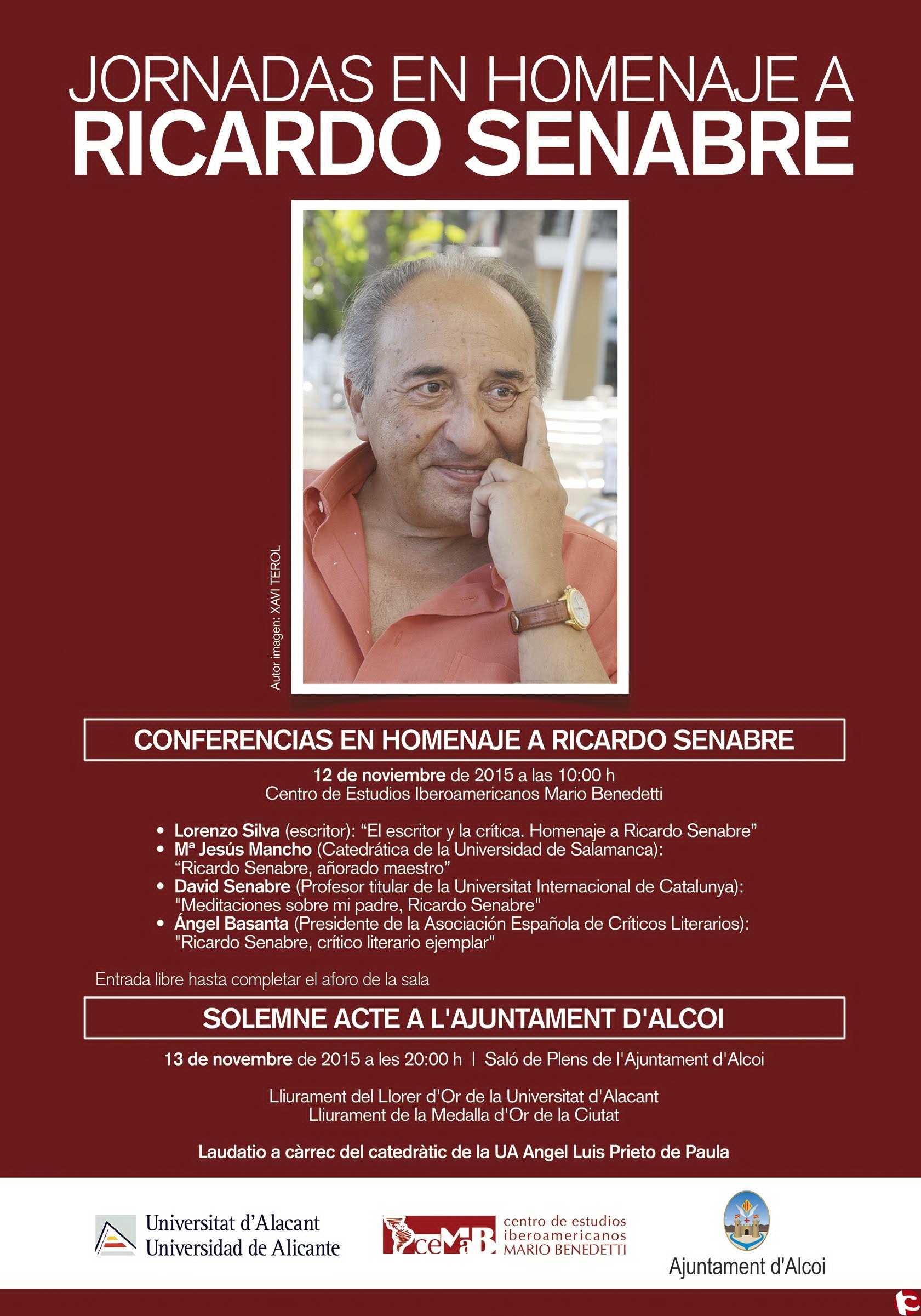 El escritor Lorenzo Silva, la catedrática de la Universidad de Salamanca, María Jesús Mancho, el presidente de la Asociación Española de Críticos Literarios, Ángel Basanta y el hijo del homenajeado, el profesor de la Universidad Internacional de Cataluña, David Senabre, participarán el próximo jueves, día 12 de noviembre, en una jornada de homenaje a Ricardo Senabre. Organizadas por la Universidad de Alicante a través del Centro de Estudios Iberoamericanos Mario Benedetti, en colaboración con el Ayuntamiento de Alcoy, las conferencias abordarán los distintos aspectos de la vida del insigne profesor, académico y crítico literario recientemente fallecido. El escritor y la crítica, añorado maestro, crítico literario ejemplar y meditaciones sobre mi padre, son algunos de las facetas que destacarán los ponentes, a quienes unió un vínculo personal y profesional con Senabre.